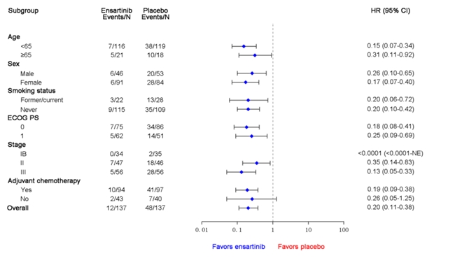 截止到2025年6月26日,在II-IIIB期患者中,两组中位随访时间均为24.0个月。DFS HR为0.20(95% CI: 0.11-0.38;p<0.0001);恩沙替尼组2年DFS率为86.4%,安慰剂组为53.5%。在ITT人群中,DFS HR为0.20(95% CI: 0.10-0.37; p<0.0001);恩沙替尼组2年DFS率为87.3%,而安慰剂组为57.2%。各亚组中,倾向于恩沙替尼的DFS获益一致。在ITT人群中观察到具有临床意义的CNS-DFS益处(HR 0.22;95% CI: 0.08-0.60)。OS不成熟(1%成熟度)。安全性与恩沙替尼的已知安全性一致。