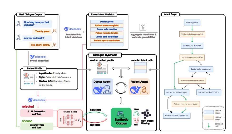 在技术架构上,该框架构建了层层递进的质量保障体系:首先通过 “意图graph规划”,从真实门诊对话中抽取 “医生问诊症状时长”“患者反馈用药情况” 等医疗意图,聚合意图转换规律、估算意图出现概率,形成符合临床问诊逻辑的线性意图骨架与意图graph,避免脱离医疗场景的无效交互;其次依托 “双智能体仿真”,结合抽取的意图graph与随机采样的患者画像(含年龄、性别、疾病信息、语言风格等),分别启动 “医生智能体” 与 “患者智能体”,模拟临床问诊流程生成多轮连贯对话,如医生智能体询问 “您糖尿病病史多久?”,患者智能体结合画像反馈 “二十年了,目前在用短效胰岛素”;最后通过 “规则 - 奖励质量控制”,一方面以医学规则过滤错误用药建议、矛盾症状描述等不符合临床常识的内容,另一方面用奖励模型对对话质量打分,仅保留高仿真、高医学一致性的合成数据,形成优质训练语料。