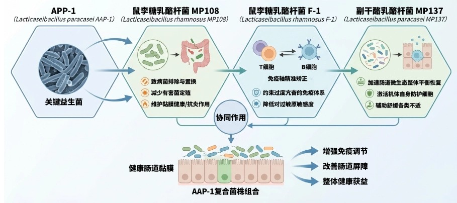 为了更全面地解决单一成分的不足,科研人员将AAP-1与另外几款具有明确功能指向的特定菌株结合,形成一个功能互补的组合。其中,鼠李糖乳酪杆菌MP108表现出了优异的致病菌排除与置换能力,能有效减少肠道有害菌定殖,并在维护黏膜健康方面发挥关键的抗炎作用。鼠李糖乳酪杆菌F-1,则将核心聚焦于免疫轴的精准矫正,进一步约束过度亢奋的免疫体系,降低身体对外界过敏原的敏感程度。此外,副干酪乳酪杆菌MP137的协同,不仅加速了肠道微生态整体平衡的恢复,还能有效激活机体自身的防护细胞,辅助舒缓已经发生的各类不适。