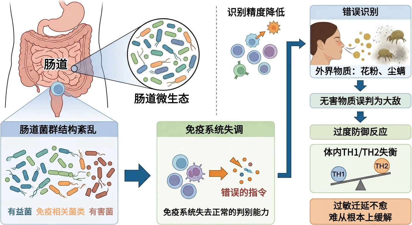 事实上,过敏并不仅仅是对外界环境的过激反应,还与身体内部的防御系统出现了误判有关。人体七成以上的免疫细胞都集中分布在肠道,这里是人体免疫调节的核心枢纽。肠道微生态的稳定状态,直接决定了免疫系统的识别精度与应答逻辑。当肠道菌群结构出现紊乱时,免疫系统便会失去正常的判别能力,把花粉、尘螨等原本无害的外界物质当成大敌,从而产生过度的防御反应。这种错误的指令最终会引发体内TH1/TH2免疫失衡,而这正是过敏迁延不愈、难以从根本上缓解的内在机理。